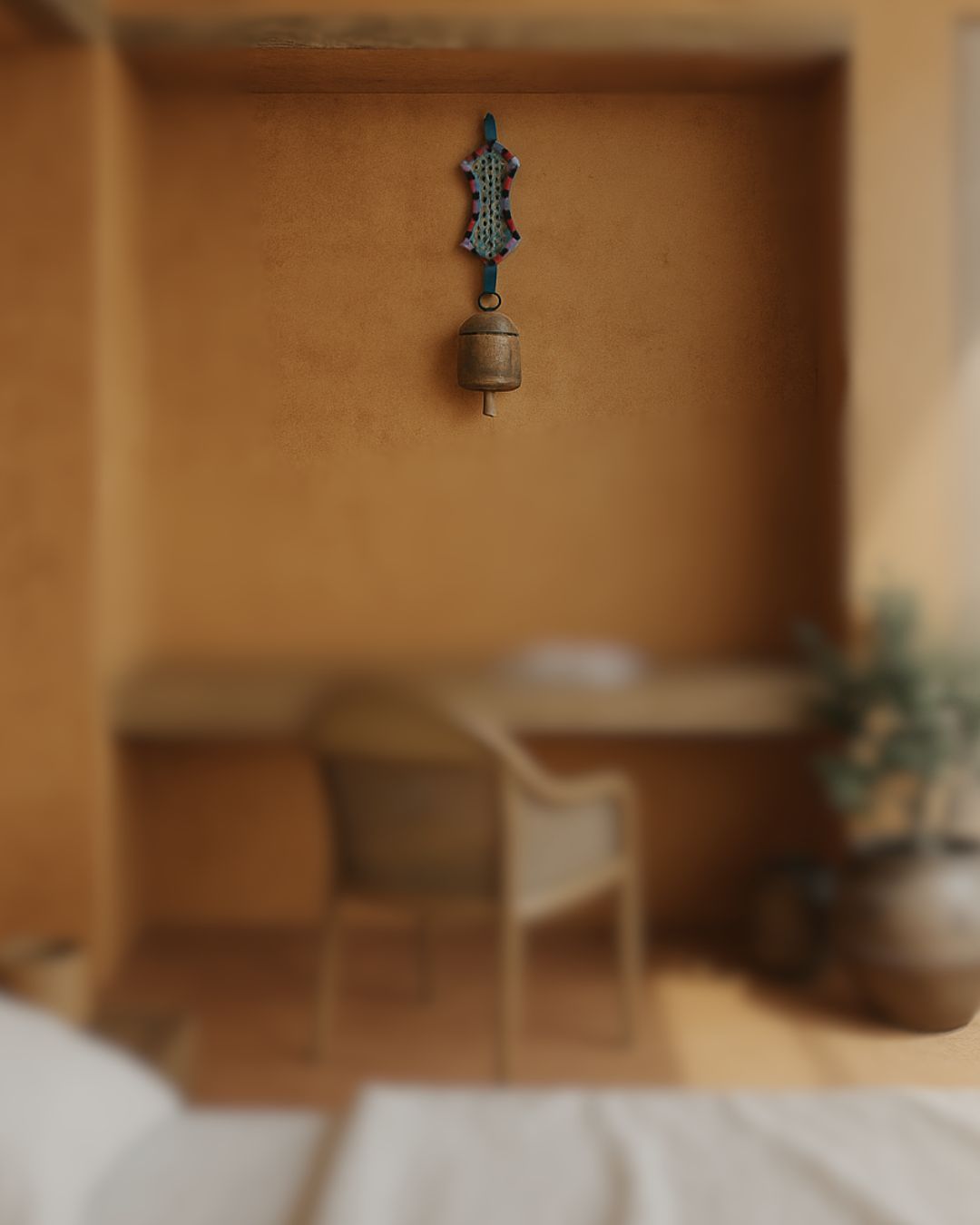 Traditional bell with turquoise woven fabric top, colorful geometric border; rustic charm with cultural roots.